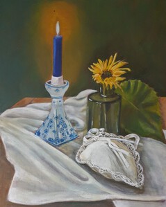 2021Doek porselein en glas, bloem en geurkussentje,je zou het kunnen ruiken.....lavendel?